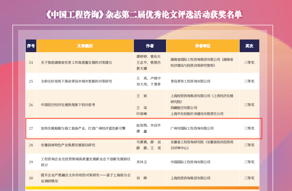 廣州國(guó)際咨詢公司榮獲《中國(guó)工程咨詢》雜志第二屆優(yōu)秀論文獎(jiǎng)